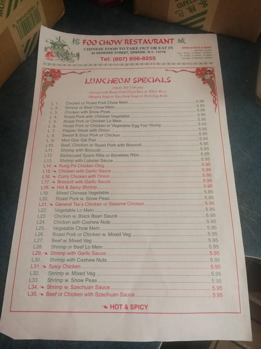 Foo Chow Restaurant, located at 46 Genesee St, Greene, NY, offers a diverse and satisfying menu that caters to a variety of tastes, perfect for anyone craving traditional Chinese flavors with a twist. Their Daily Special Combos are a great value, featuring crowd-pleasers like General Chicken, Sesame Chicken, Sweet & Sour Chicken, and Honey Chicken-each priced affordably. For a lighter option, the Chicken & Broccoli combo provides a healthy and flavorful alternative, all crafted with fresh ingredients.